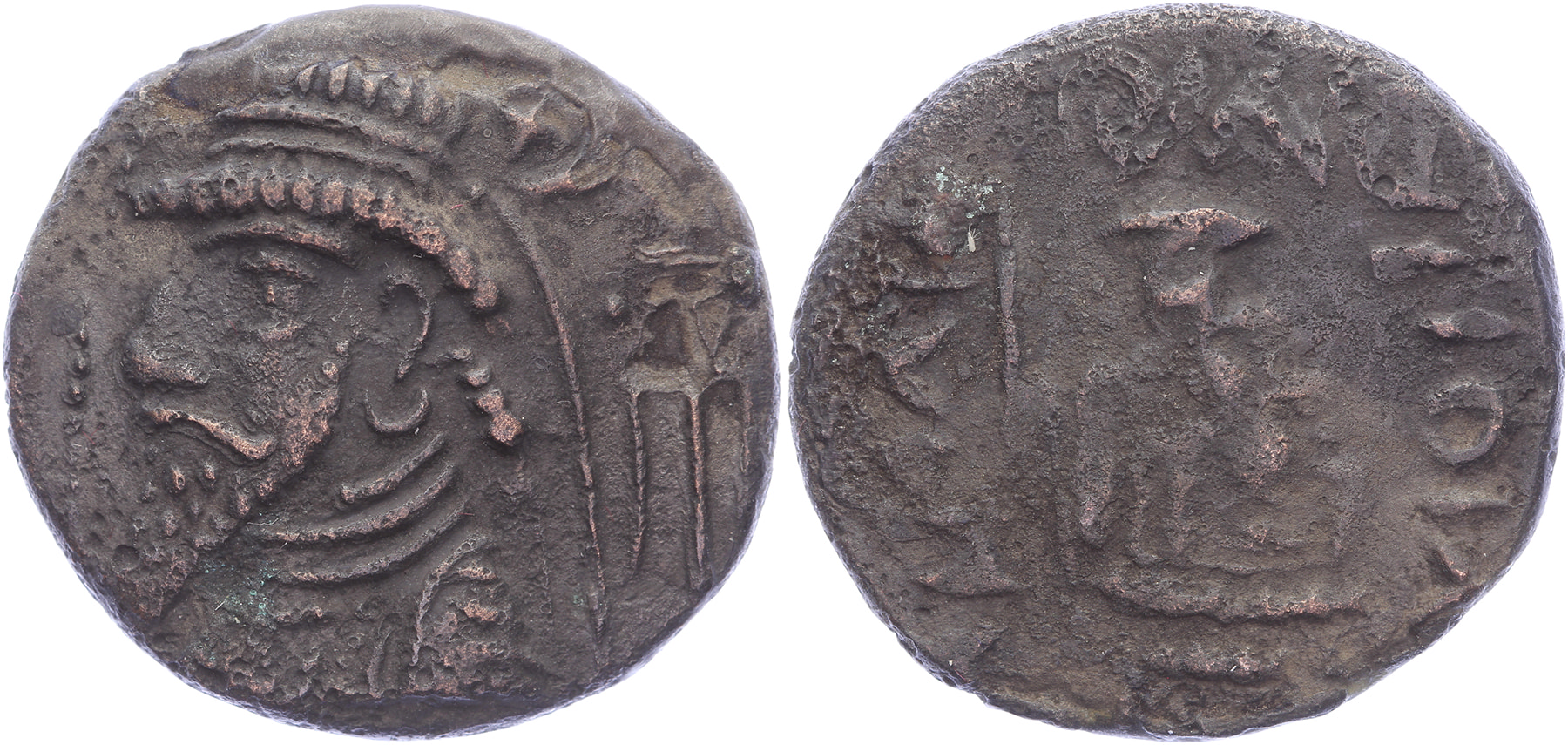 Circa 1st Century BC-1st Century AD. Billon Tetradrachm [28,27 mm; 14,82 gm]. Diademed bust left; star and crescent, pellet and anchor behind / Blundered legend around diademed bust left. Alram NB1; BMC Arabia pg. 250, 13; MACW 703-706. Rough surfaces, VF.