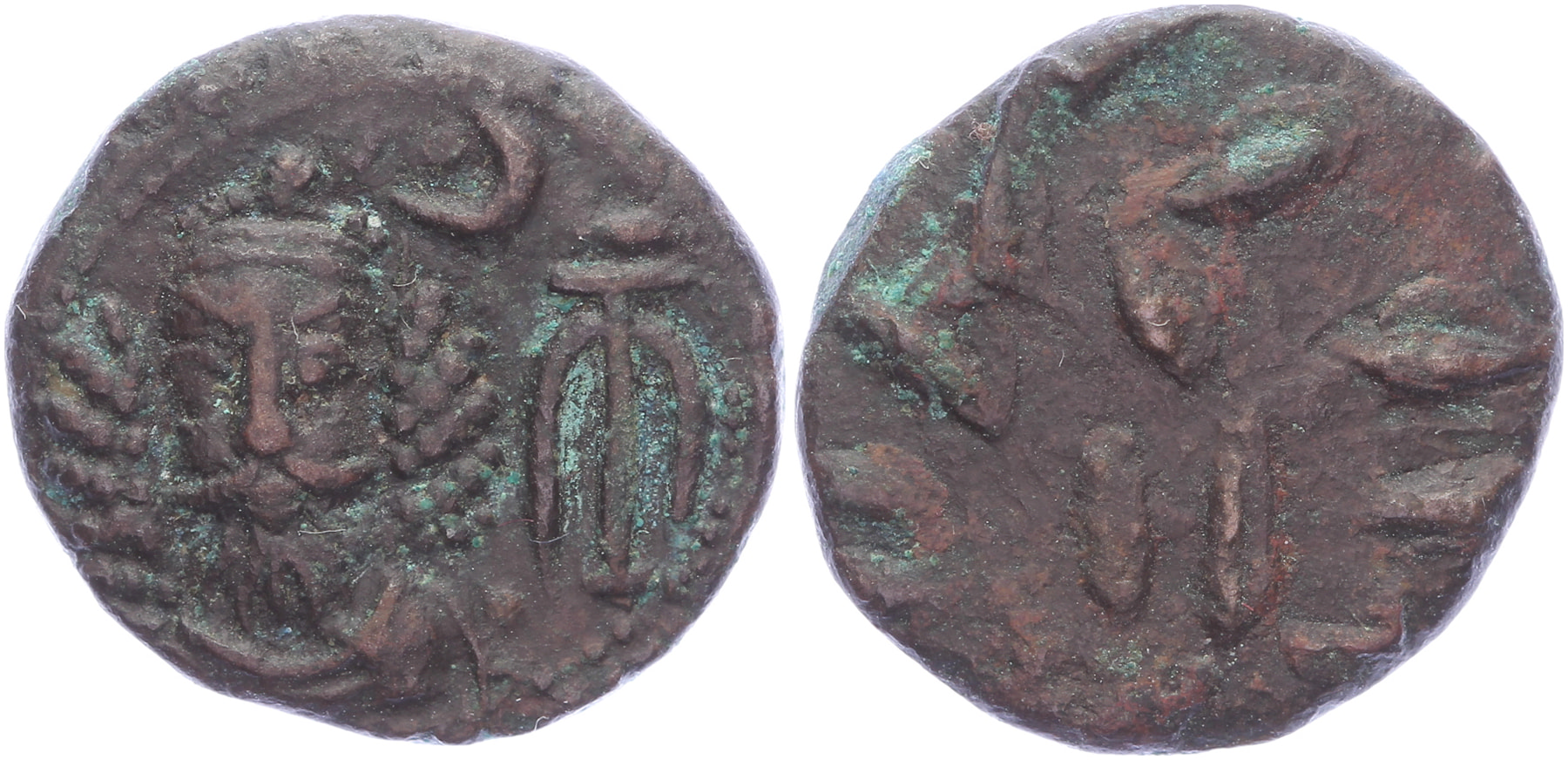 Early to mid 2nd Century AD. AE Drachm [16,10 mm; 2,94 gm]. Diademed bust facing slightly left with downwards tufts of hair, on right a pellet within crescent above inverted anchor with double cross bar / Irregular pattern of dashes. van’t Haaff 12.3.1-2Bd-f. VF.