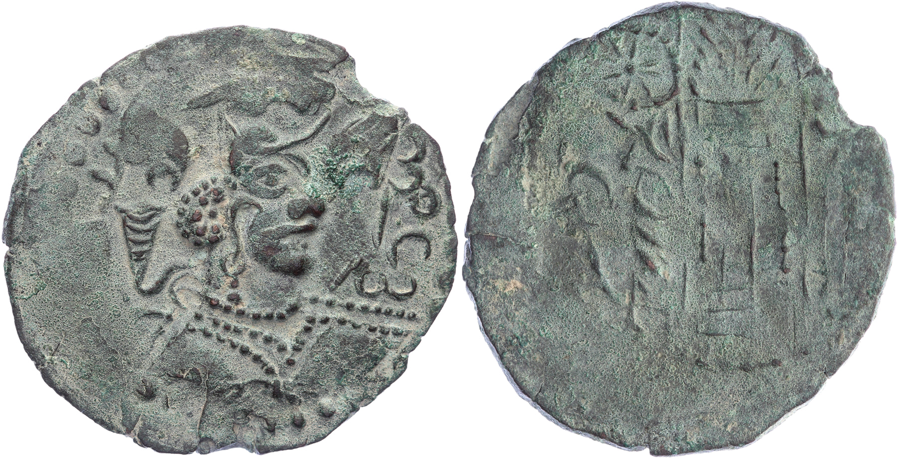 Sixth Century AD. AE Drachm [26,47 mm; 3,84 gm]. Bust right wearing headdress surmounted by bull’s skull / Crude fire-altar with attendants. Göbl Hunnen Em 198.12. VF.