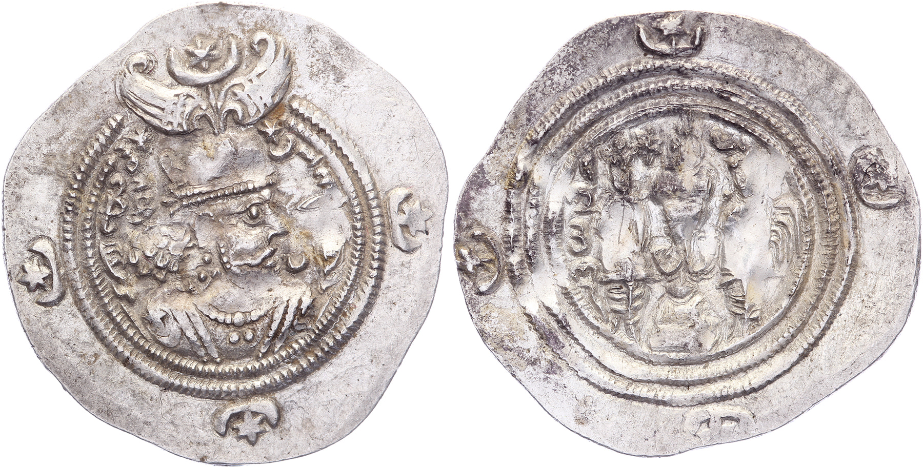 AR Drachm [29,95 mm; 4,17 gm]. BYŠ (Bishapur). Draped bust of Hormizd IV to right, wearing elaborate mural crown with frontal crescent and korymbos set on crescent; before head, WHLMZD (‘Hormizd’ in Pahlawi) / Fire altar flanked by two attendants; in upper left field, six-pointed star; in upper right field, crescent; to left, date; to right, BYŠ (name of the mint in Pahlawi). SSCT 1082. VF.