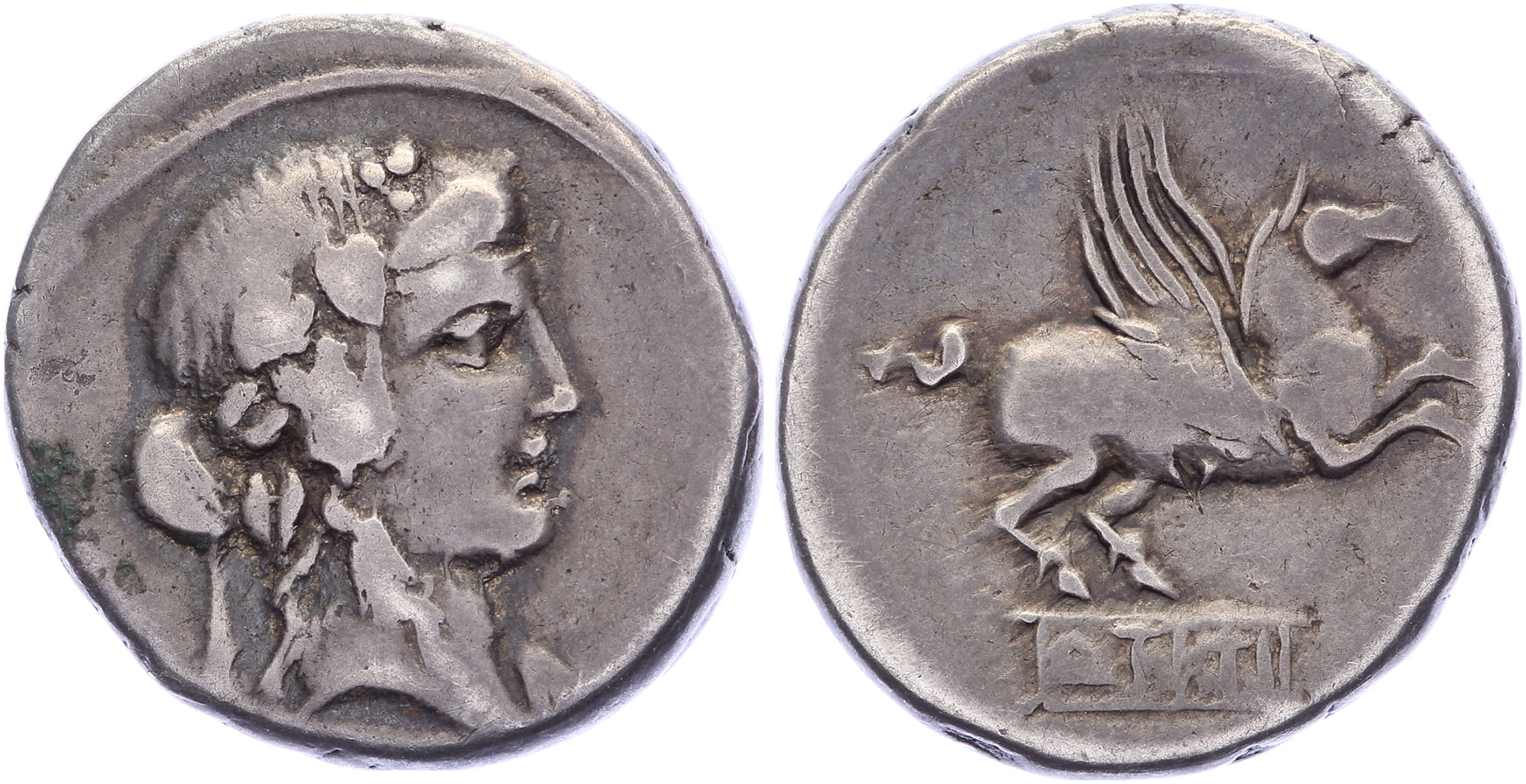AR Denarius [17 mm; 3,99 gm]. Rome mint. Wreathed head of young Bacchus or Liber right / Pegasus springing right on tablet inscribed Q•TITI. Crawford 341/2, Sydenham 692, Titia 2. Cabinet toning, VF.