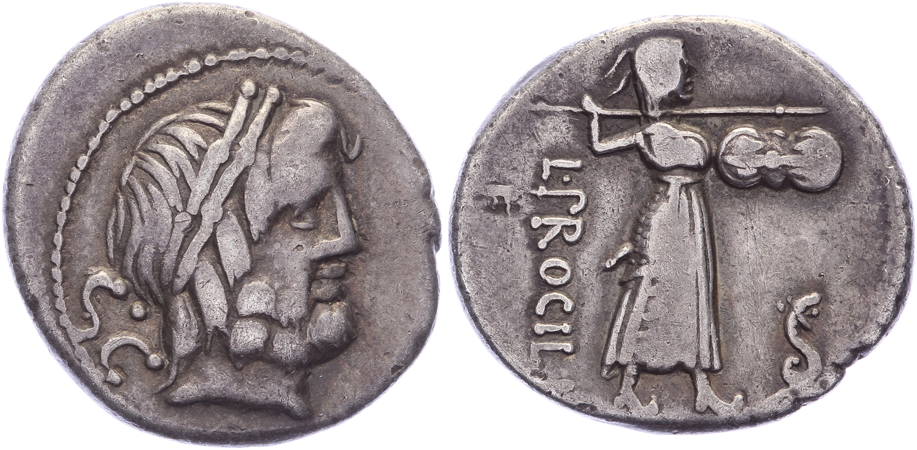 AR Denarius [17 mm; 3,57 gm]. Rome mint. Laureate head of Jupiter right, SC behind / Juno Sospita advancing right, hurling spear and holding shield decorated with thunderbolt; serpent to right. Crawford 379/1, Sydenham 771, Procilia 1. Nicely toned, F/VF.