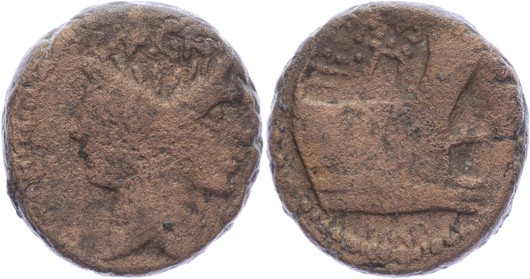 AE As [27,14 mm; 19,58 gm]. Uncertain Sicilian mint. Laureate janiform head of Pompey the Great; MAGN above / Prow of galley right, galley decorated with star and eye on side; PIVS above; IMP in exergue. Martini, Sextus Pompeius 874. F.