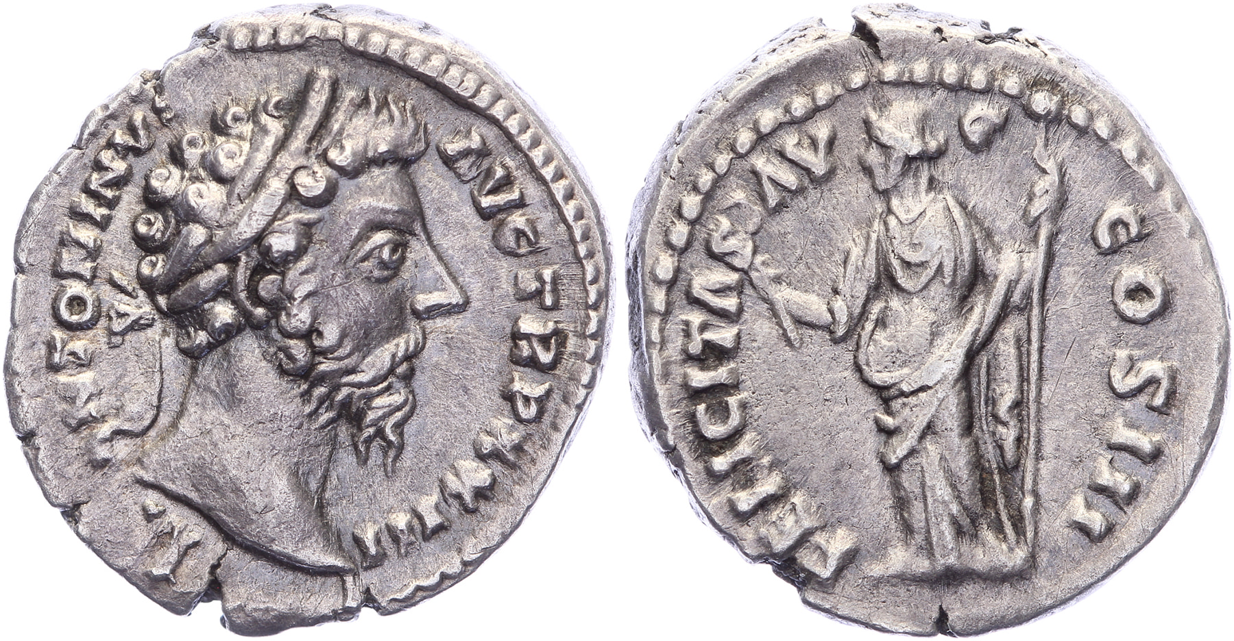 AR Denarius [17,88 mm; 3,55 gm]. Rome mint. Struck 168/9 AD. M ANTONINVS AVG TR P XXIII, laureate head to right / FELICITAS AVG COS III, Felicitas standing front, head to left, holding short caduceus in her right hand and long scepter in her left. RIC 203; BMCRE 491; Cohen 178. Toned gVF.
