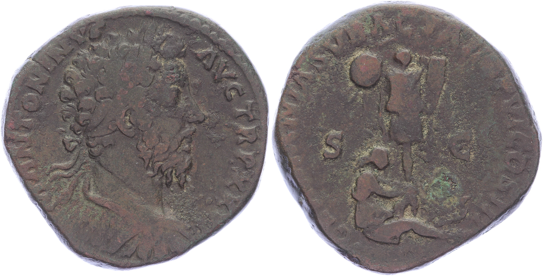 AE Sestertius [30,14 mm; 22,35 gm]. Rome mint. Struck 172 AD. M ANTONINVS AVG TR P XXVI, laureate, draped and cuirassed bust right / GER]MANIA SVBACTA IMP VI CO[S III] / S – C, trophy, at the base of which a mourning captive sits left among captured arms. BMCRE 1413; RIC 1024; Cohen 215. aVF.