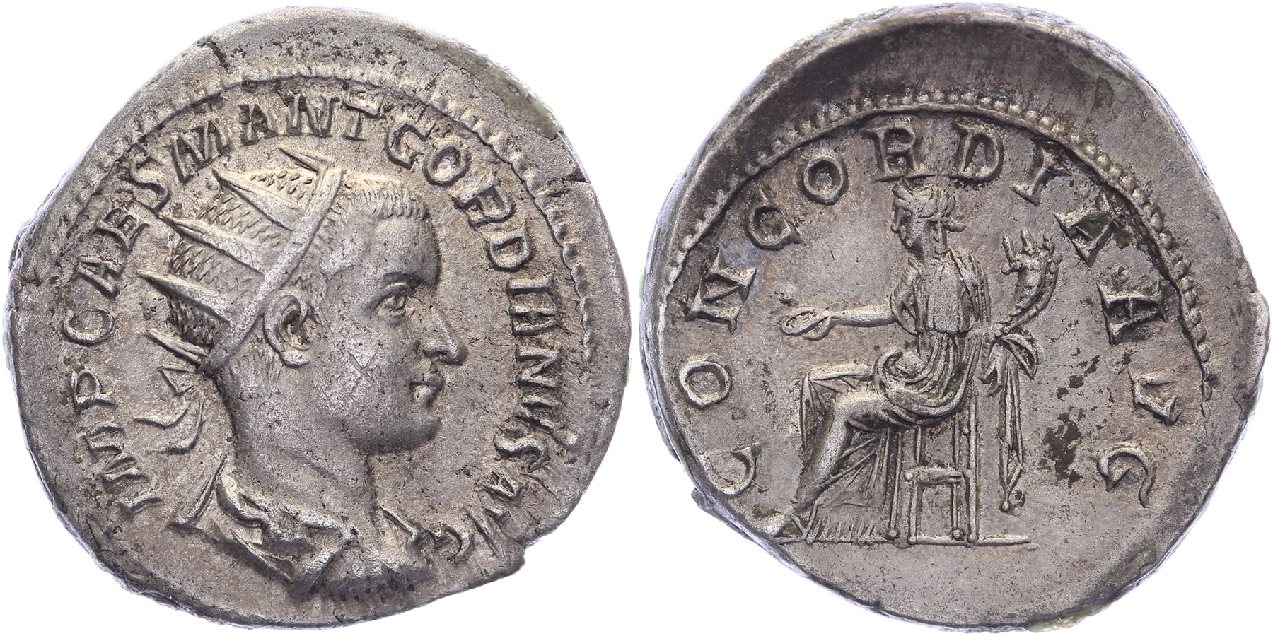 AR Denarius [22 mm; 4,64 gm]. Antioch mint. Struck 239 AD. Radiate and draped bust right / Concordia seated left in throne, holding patera in her right hand and cornucopiae in her left. RIC 35, RSC 50. Nicely toned. gVF.