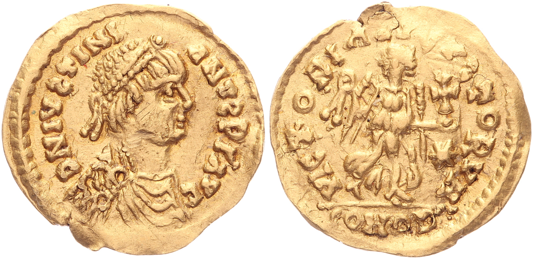 Pseudo-imperial coinage in the name of Justinian, AV Tremissis ca. 530-539 AD [15 mm; 1,47 gm]. Ravenna or Rome mint. Pearl-diademed, draped and cuirassed bust right DN IVSTINI – ANVS PΓ AVC / Victory advancing right, holding wreath in right hand and globus cruciger in left, exergue COMOB. BMC Vandals 10, MIB I, 29a. Very rare. a.XF - A Dutch detecting find from Wijk-bij-Duurstede, incl. documentation from 1989 detailing the find and its subsequent registration at the Royal Penningkabinet.