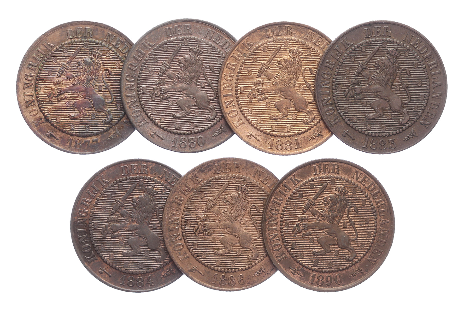 Lot (7) complete serie bronzen 2 ½ Cents 1877-1890 LSch. 560-566; Sch. 679-684, 684a Zfr. / Pr. en beter