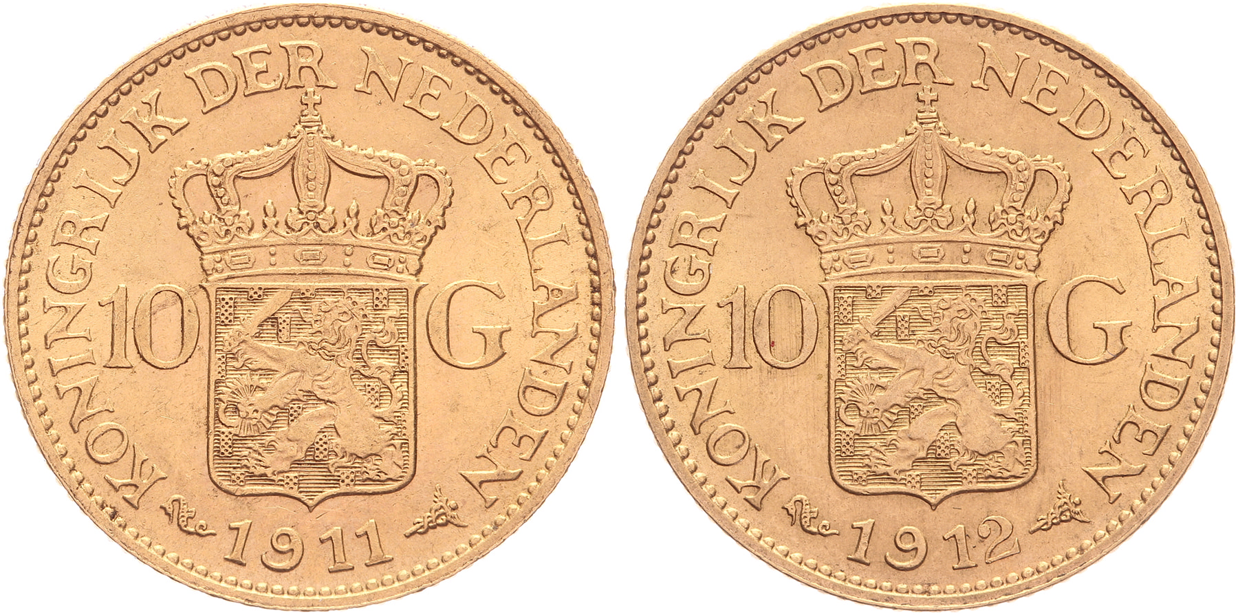 Lot (2) 10 Gulden 1911 en 1912 LSch. 631, 632; Sch. 745, 746 Prachtig