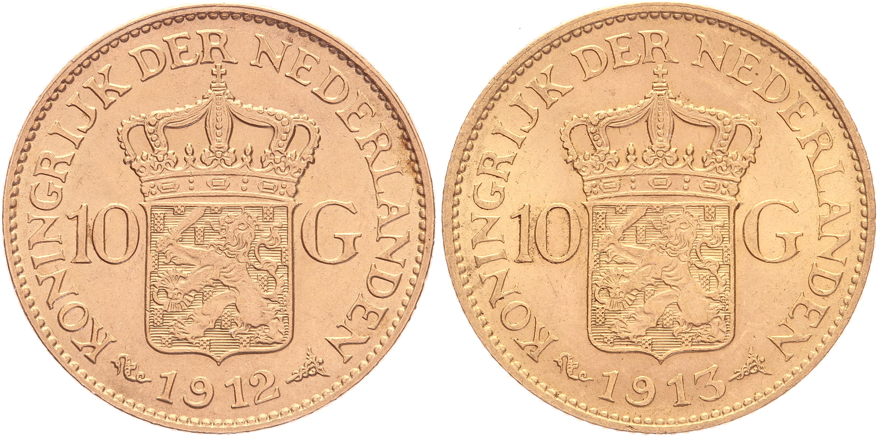 Lot (2) 10 Gulden 1912 en 1913 LSch. 632, 633; Sch. 746, 747 Prachtig