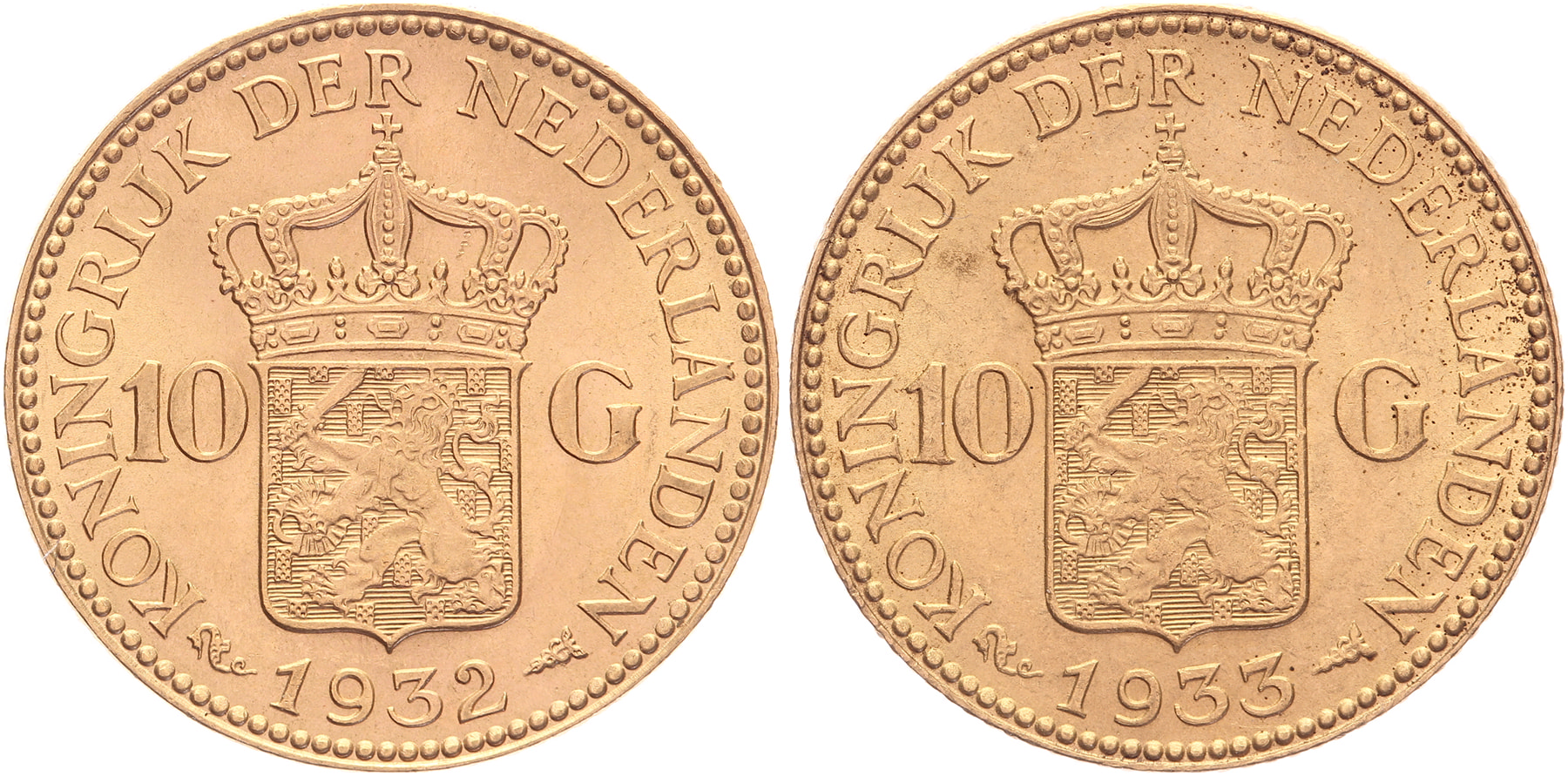 Lot (2) 10 Gulden 1932 en 1933 LSch. 638, 639; Sch. 752, 753 Zeer fraai / Prachtig