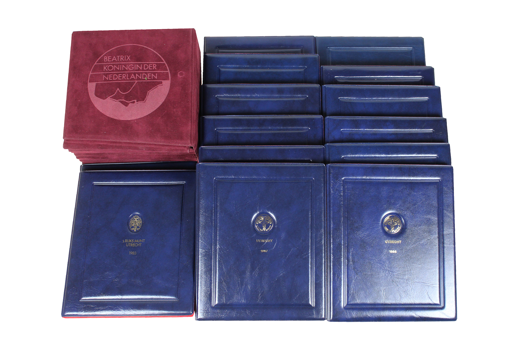 Doos met complete serie proofsets Nederland 1982 t/m 2001, totaal 19 stuks.