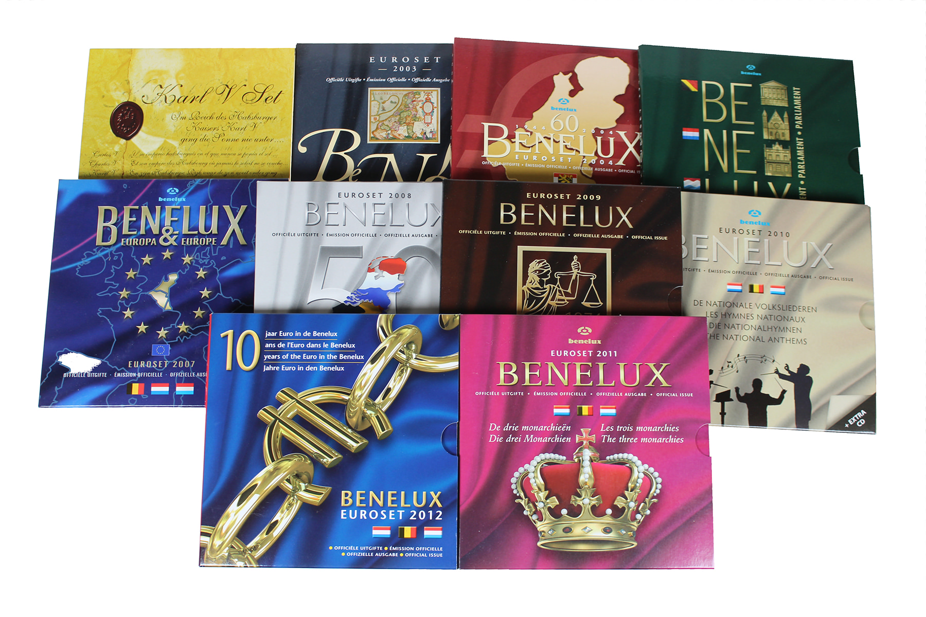 Doos met 9 x Benelux-set 2003-2012 (niet compleet). Toegevoegd: Karel V-set.