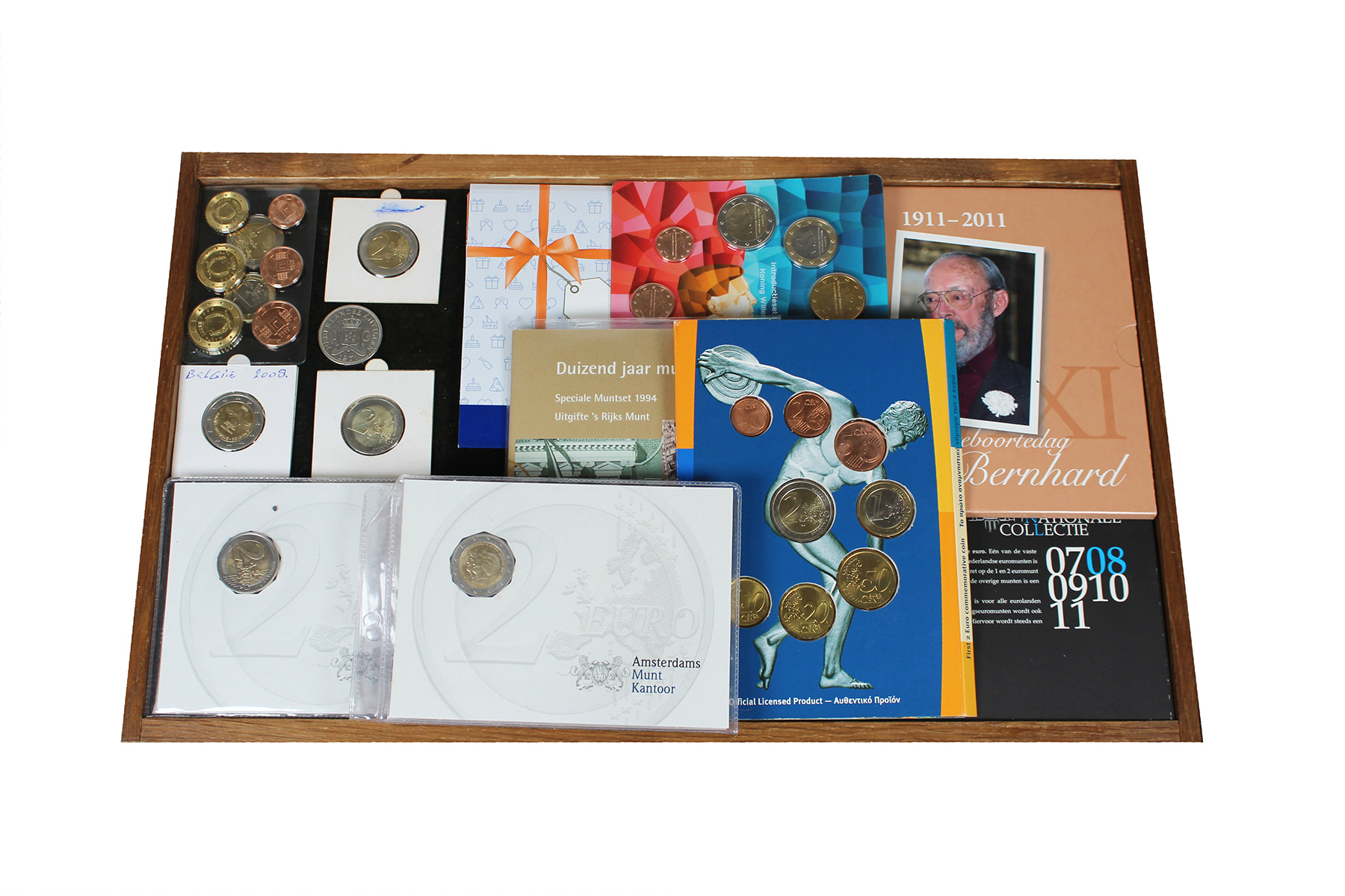 Doos met mixed lot FDC-, proof- en BU-sets Nederland en overzee etc. Ca. 30 stuks. Ook euro’s.