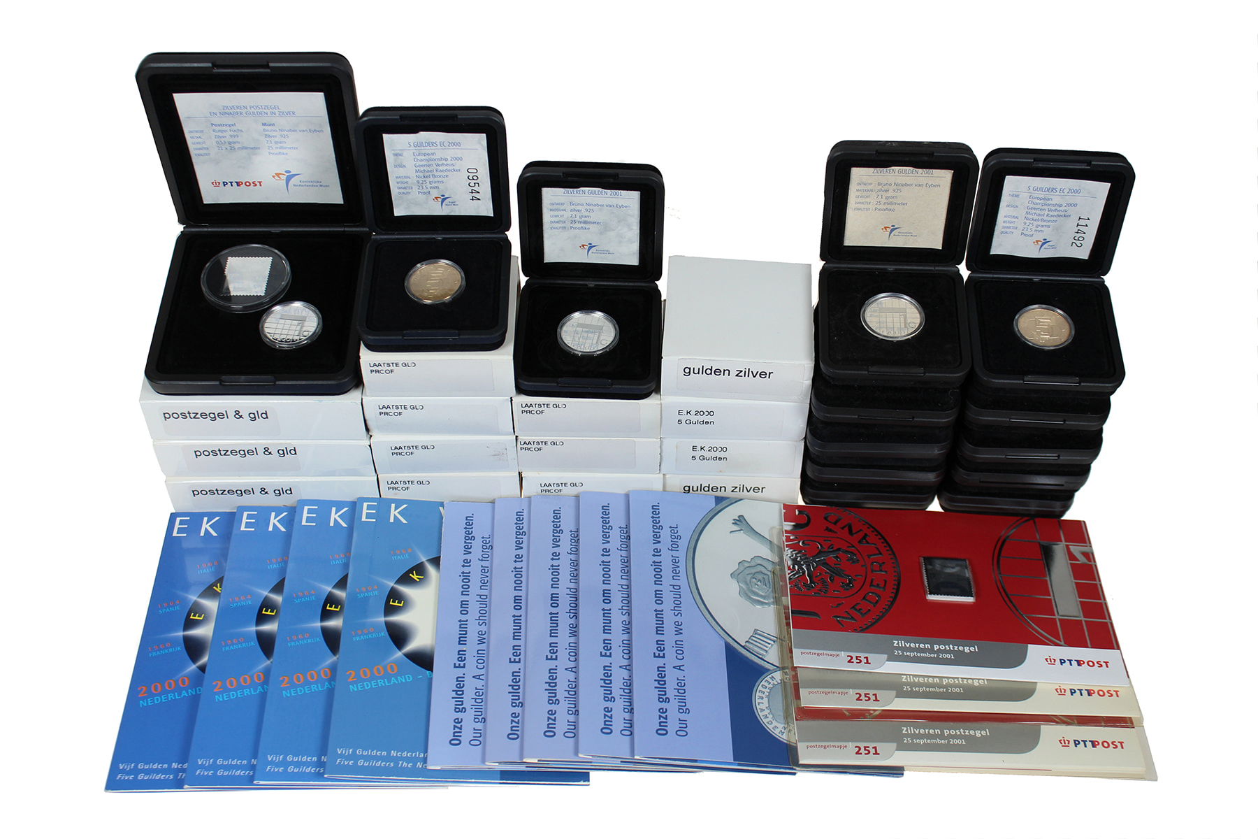 Schoenendoos herdenkingsuitgiften 2000/2001: 13 x zilveren guldens 2001 proof; 9 x laatste gulden 2001; 5 x 5 gulden EK 2000 proof (1 x klein mmt.); wat zilveren postzegels enz.