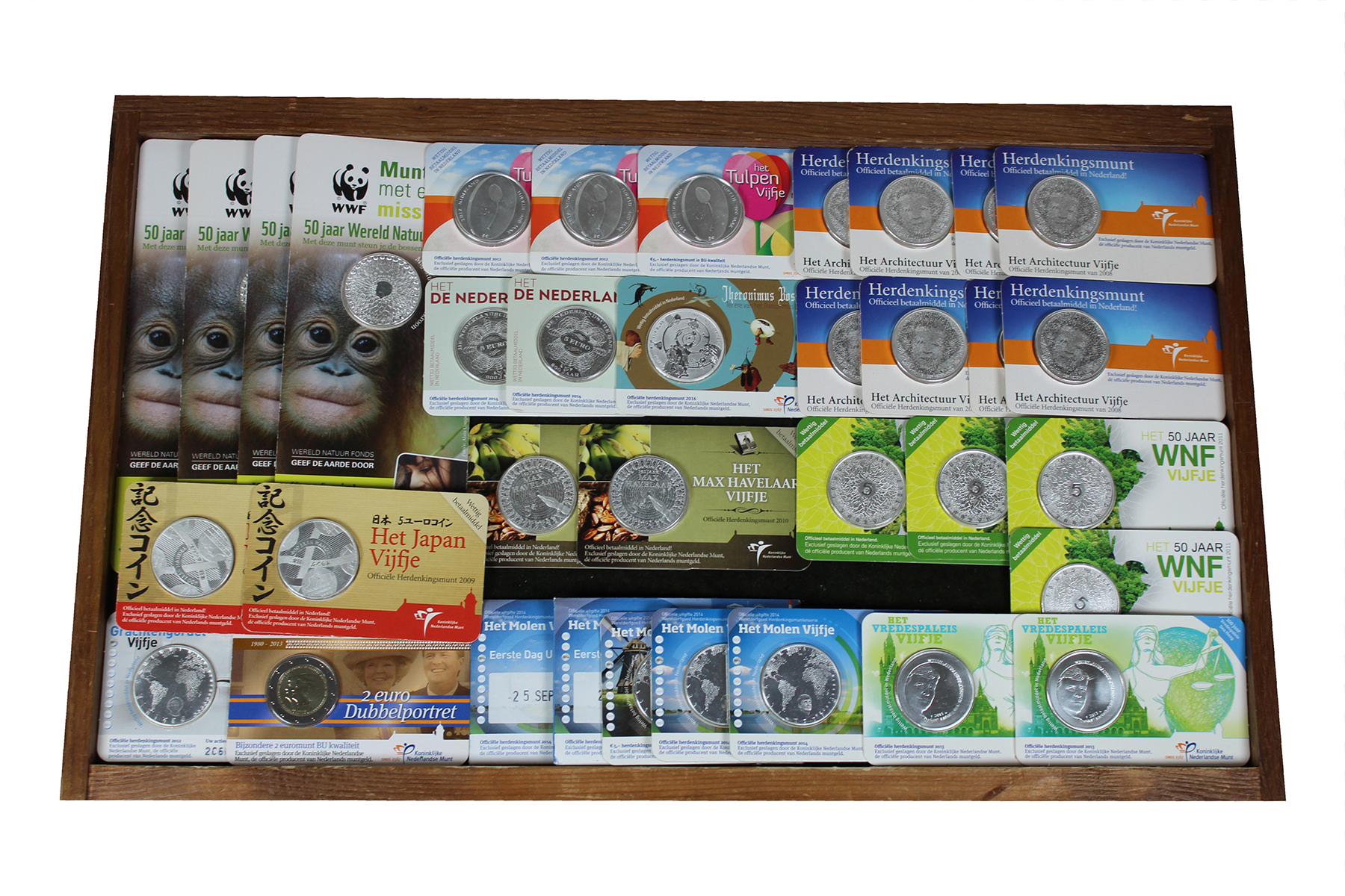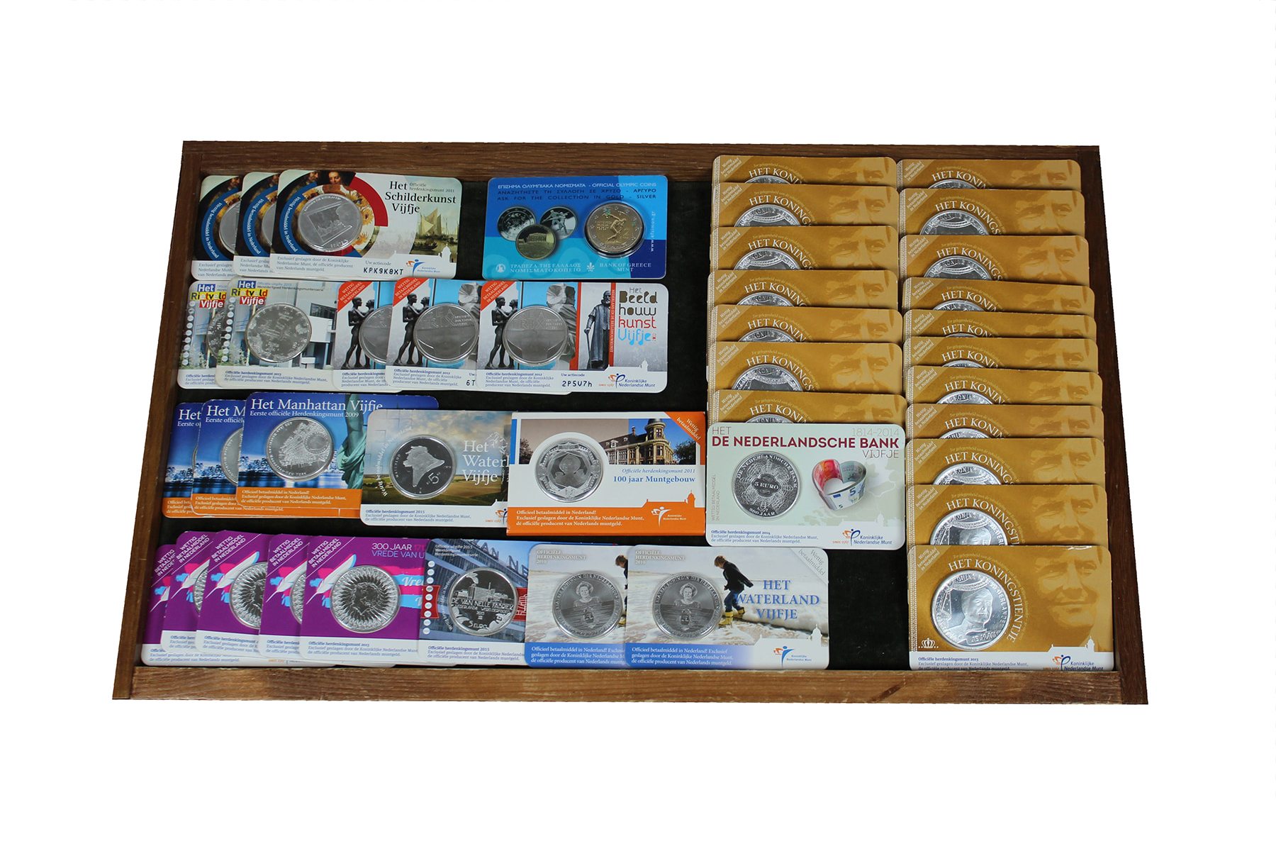 Bordeauxrode doos met Nederlandse coincards (50 x €5; 18 x €10, allen verzilverd) en 2 x €2. Nominaal ca. €400.