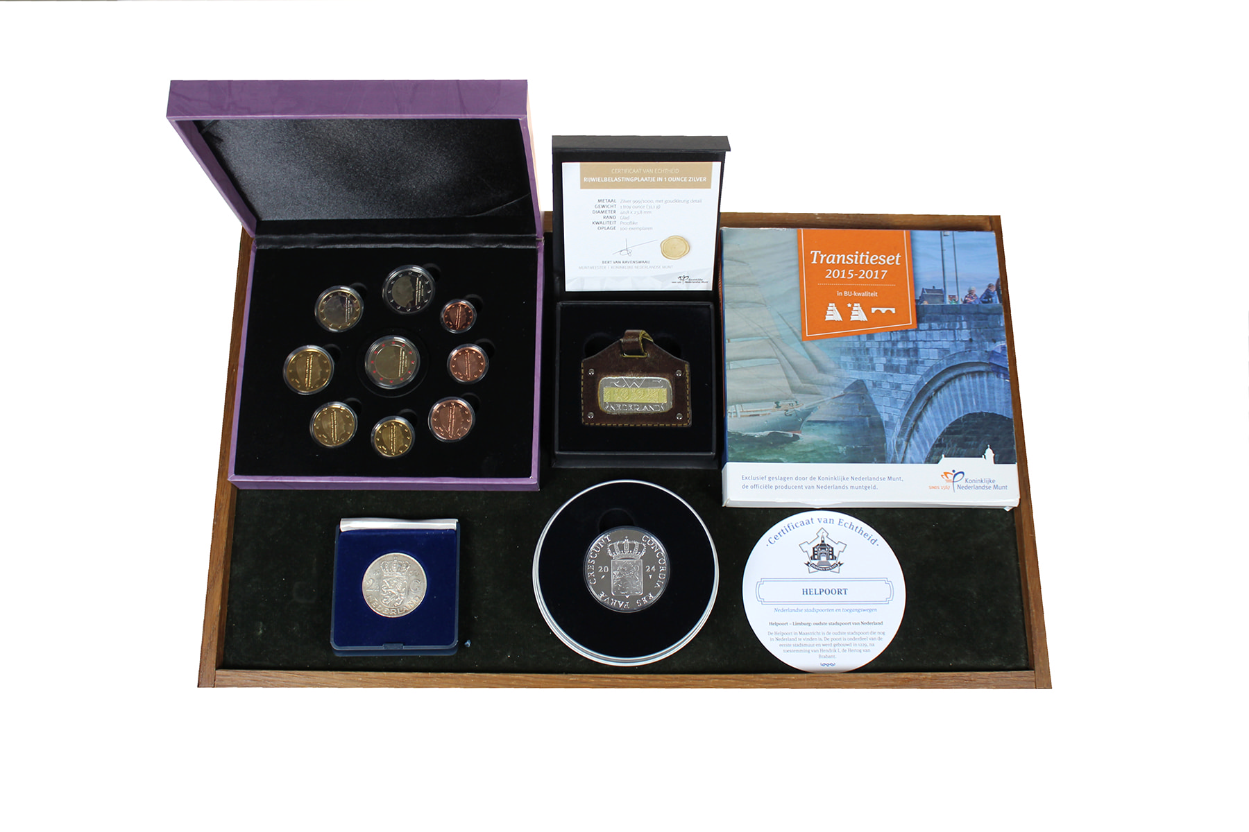 Doos met diverse moderne uitgiften, o.a. transitieset 2015-2017, proofset 2019, zilveren dukaat 2024 Helpoort, zilveren Juliana rijksdaalder met klop Maastricht! Rijwielbelastingplaatje in 1 ounce silver. Oplage slechts 100 stuks. ⁂