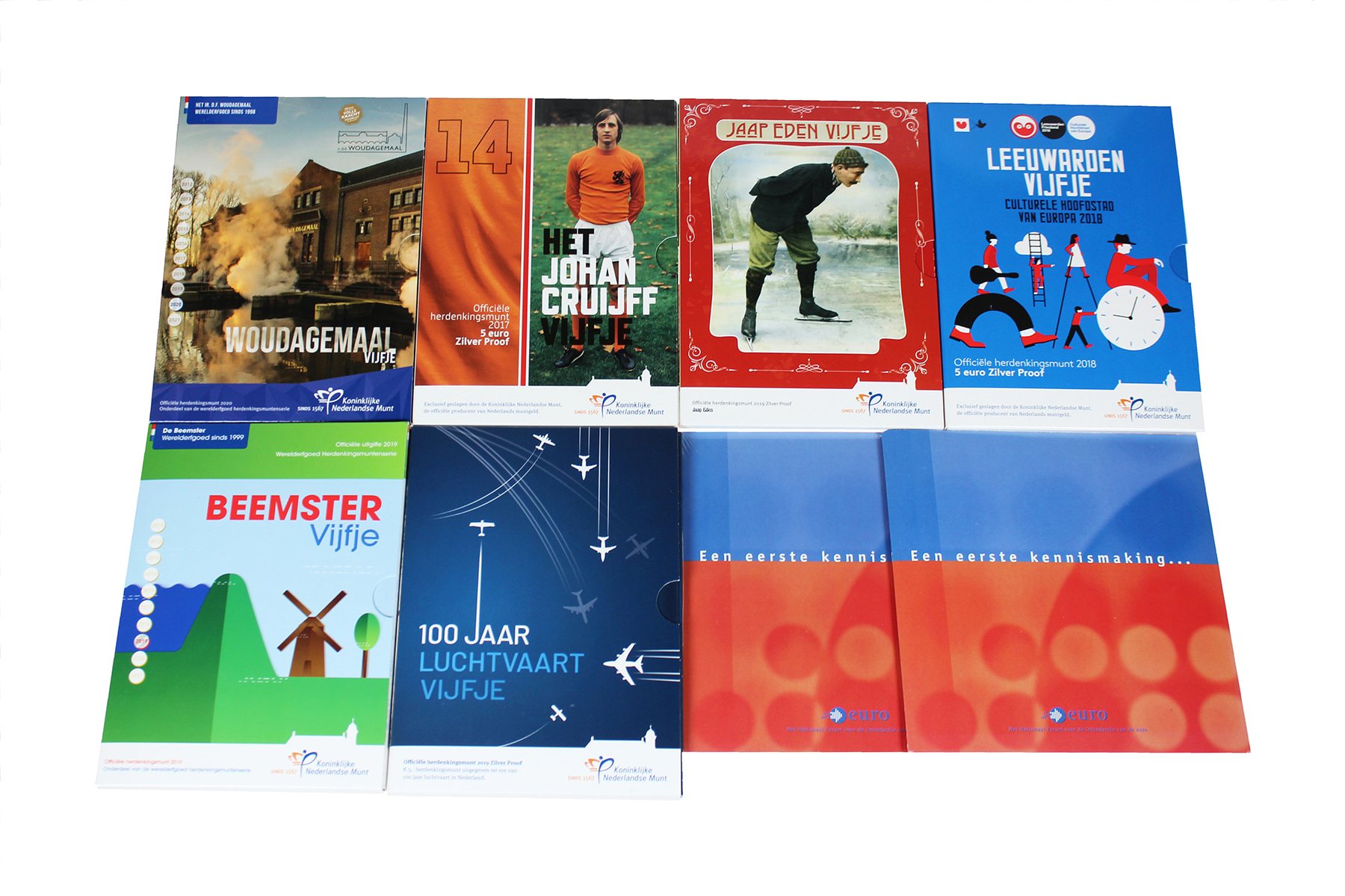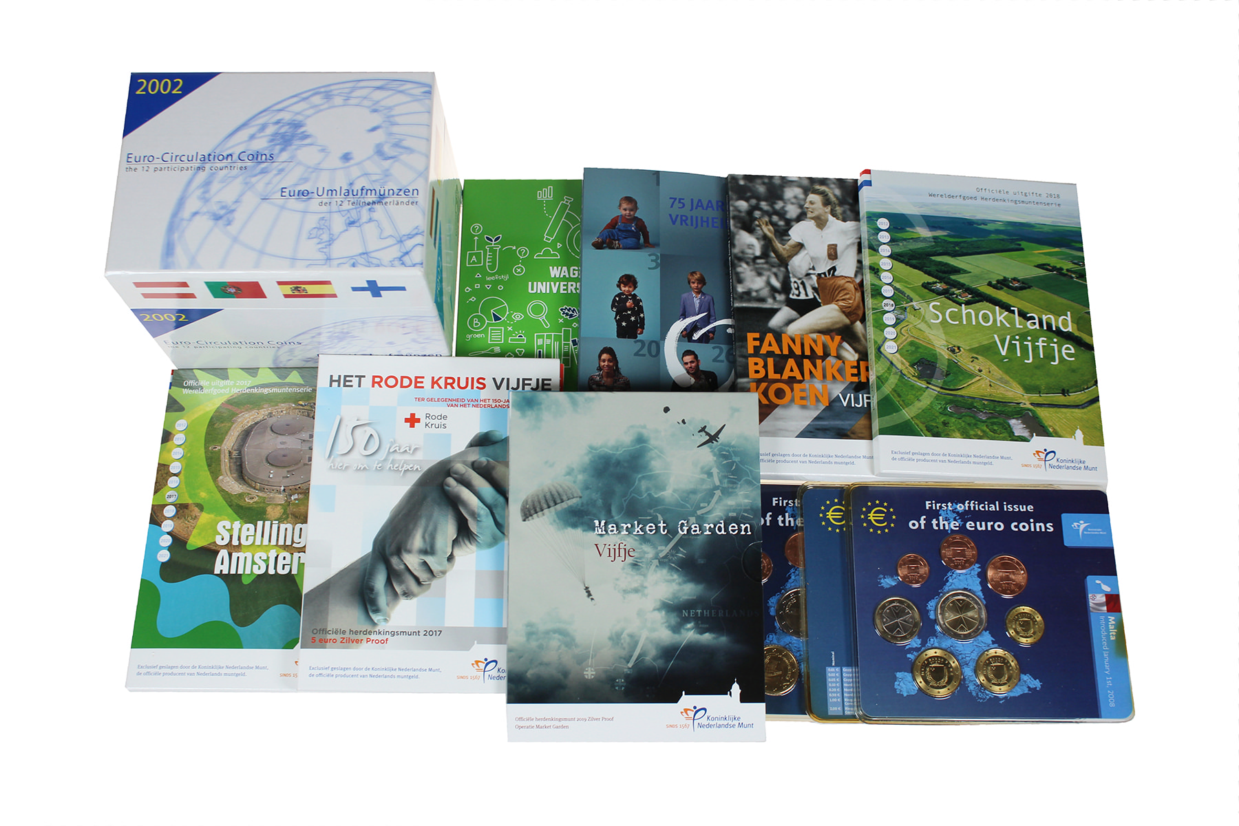 Plastic box met o.a. sets met euro circulation coins. Alsmede 13 zilveren 5 euromunten in proof.