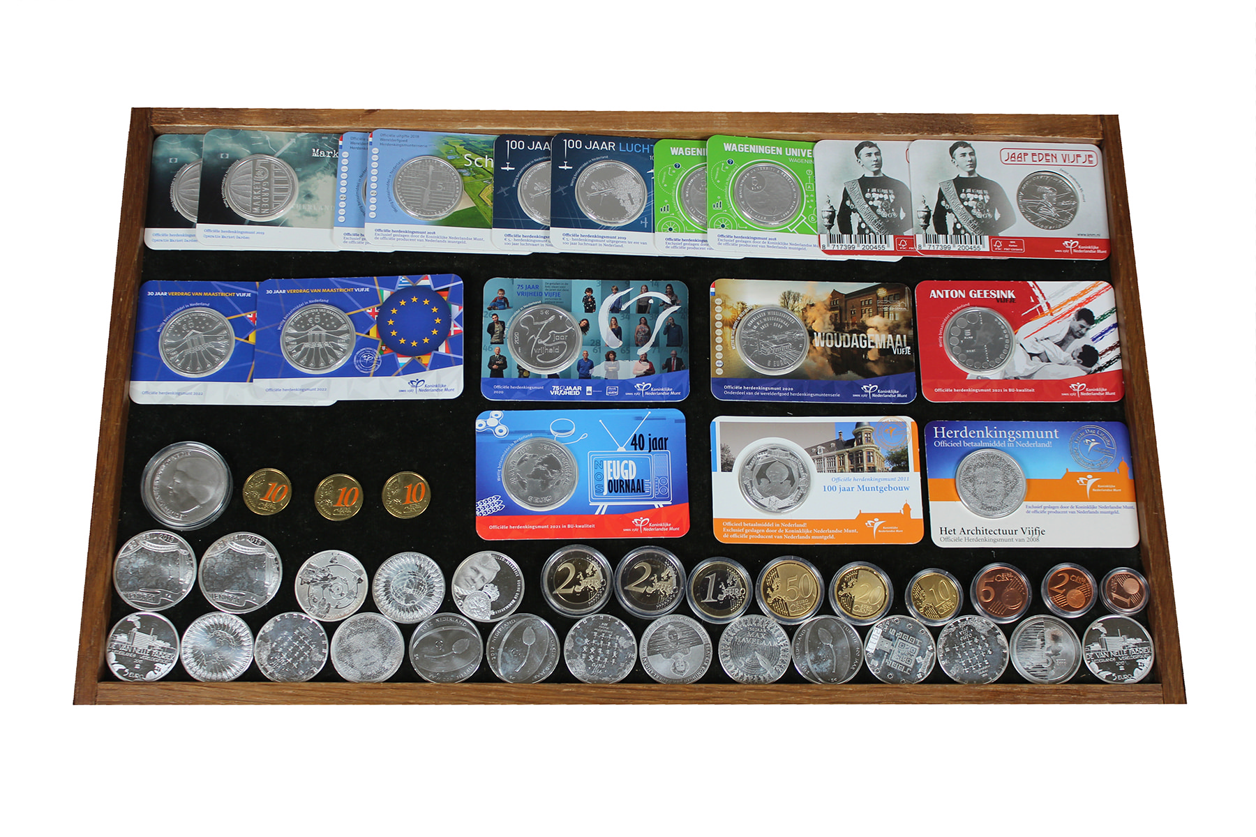 Plastic bakje met moderne euromunten, deels nominaal! O.a. 3 x 10 euro en 35 x 5 euro herdenkingsmunten.