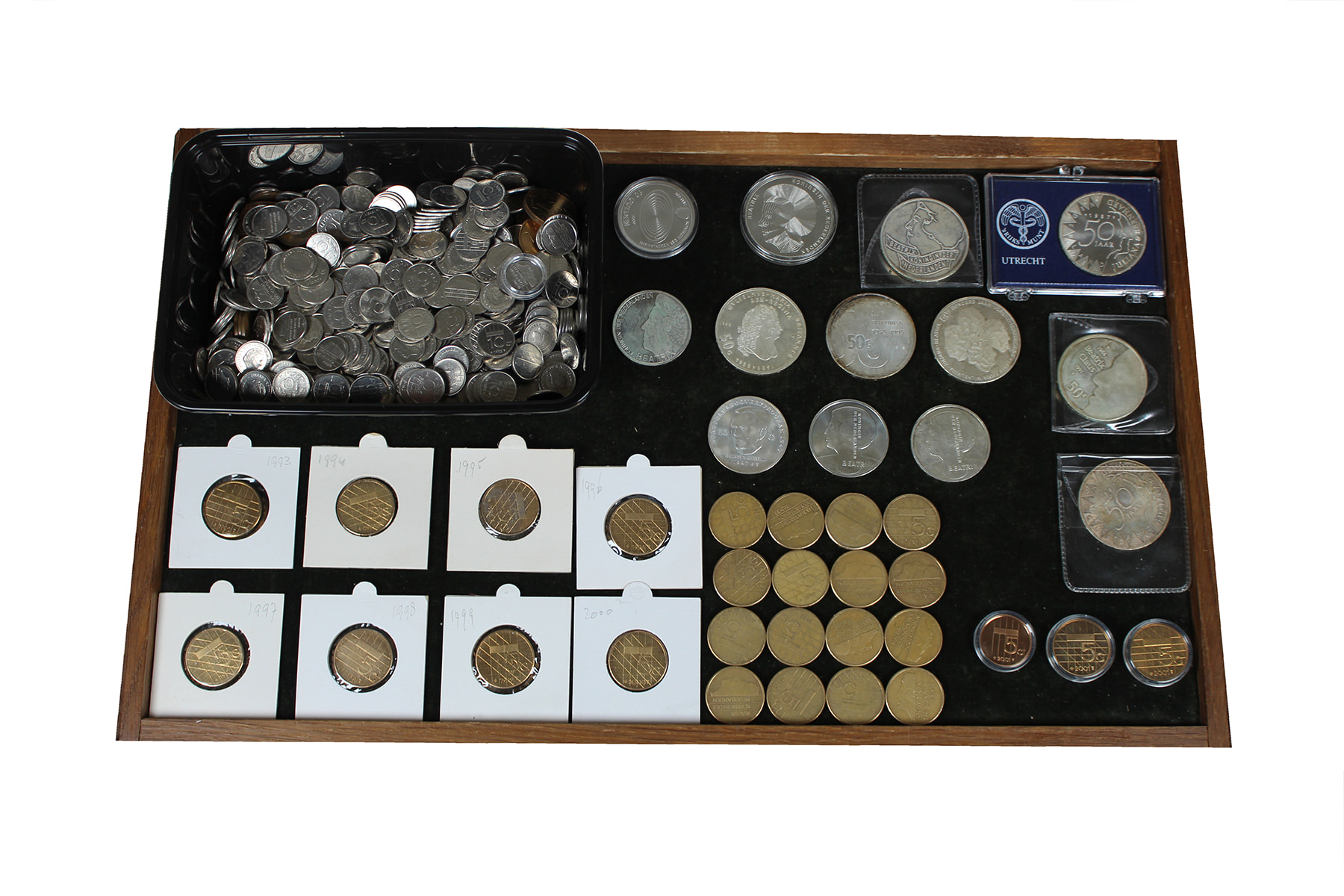 Bakje met groot aantal stuivers en dubbeltjes, alsmede 5 gulden munten uit de periode Juliana / Beatrix. Aangevuld met 9 x 50 gulden en 5 zilveren tientjes Beatrix.
