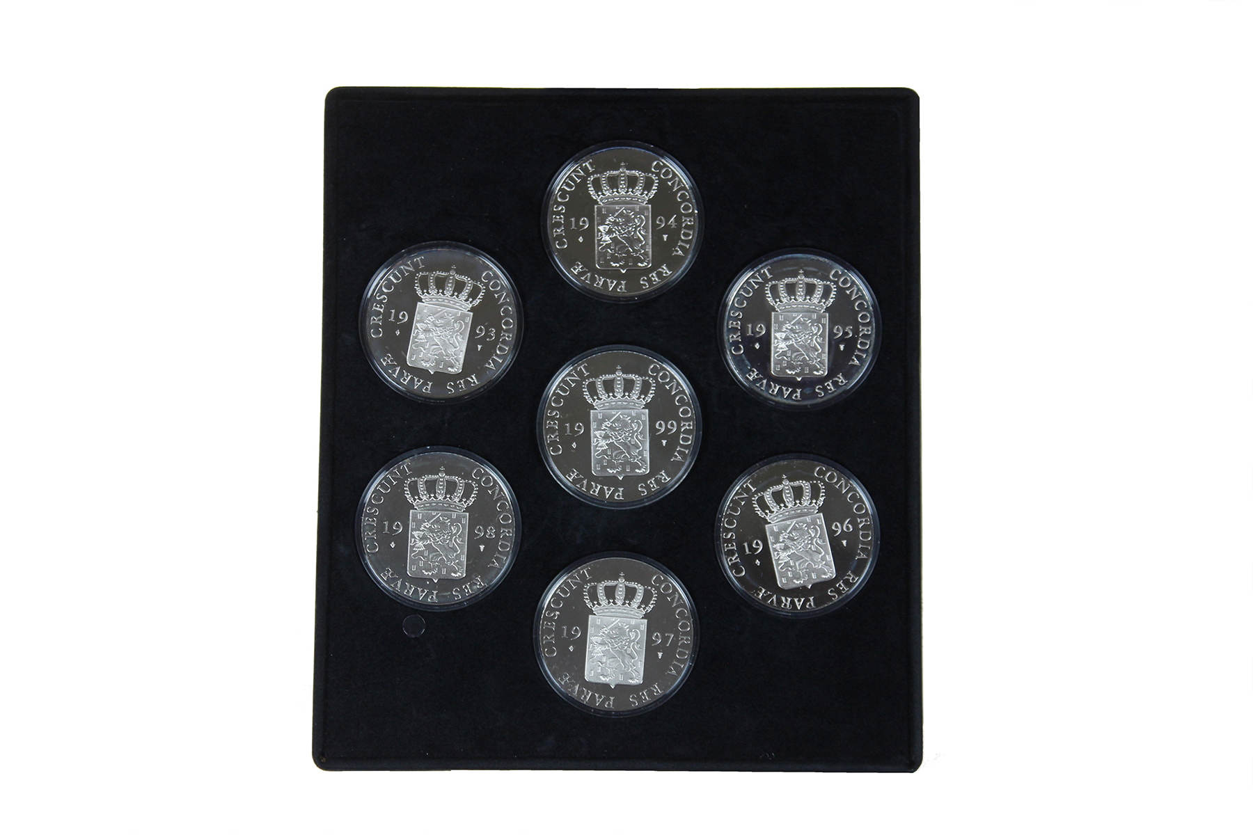 Zwarte cassette “De Zeven Provinciën I” met 7 x zilv. dukaat 1993-1999. Netto zilver: 172 gram. Proof.