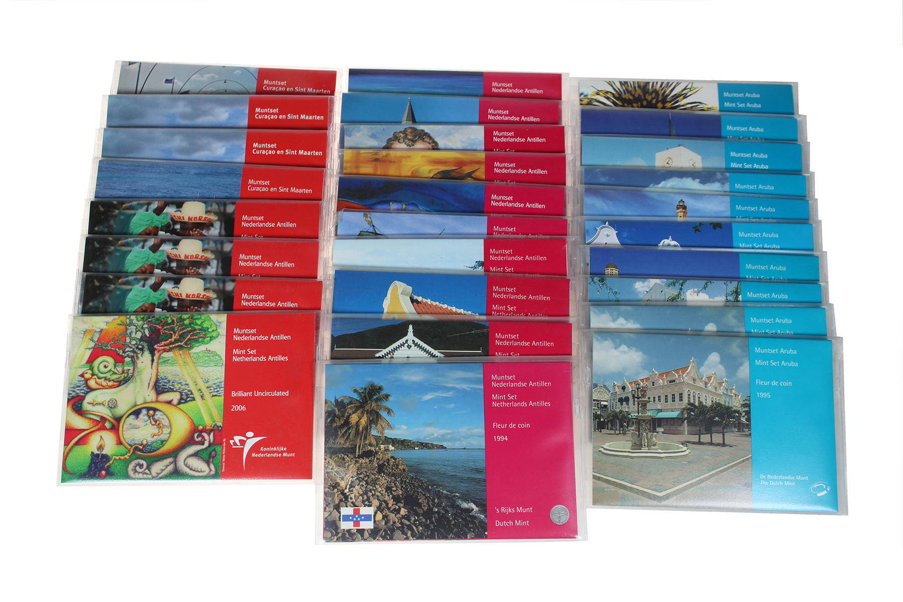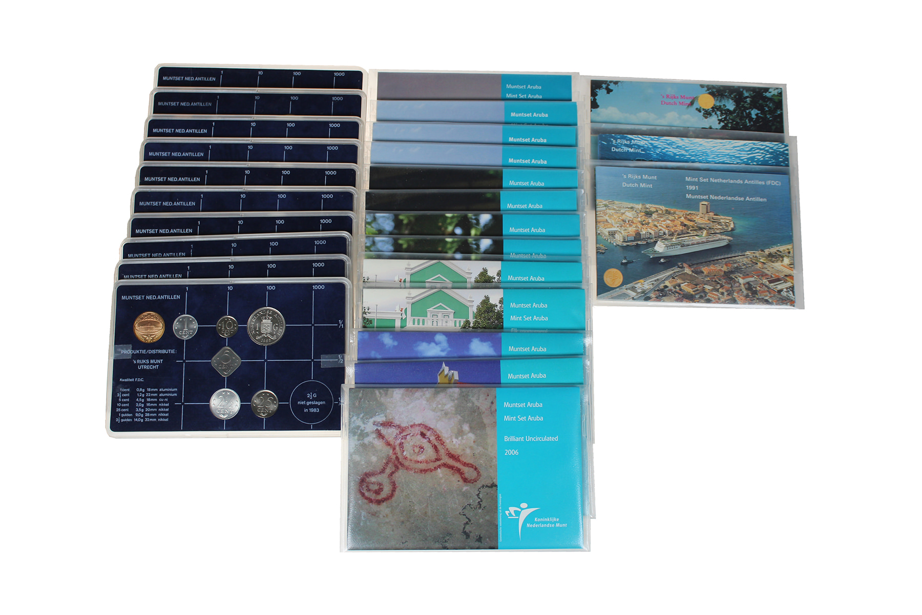 Vivo-doos met 24 x Aruba FDC-sets en 31 x Nederlandse Antillen FDC-sets (ook doubletten).