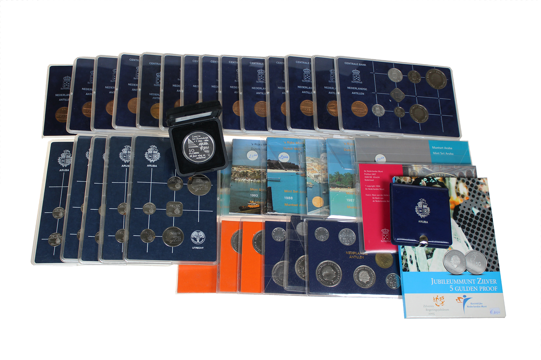 Schoenendoos (35) Aruba / Ned. Antillen. FDC-sets (32x) en 3 x zilveren herdenkingsmunt.