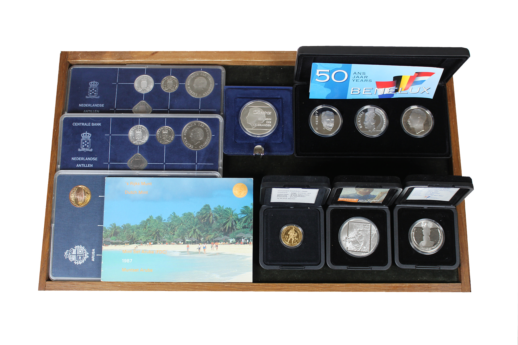 Doos met diverse moderne uitgiften, o.a. Aruba 25 florin 1986, diverse FDC-sets overzee. Verder, 7 x 5 euro en 5 x 10 euro herdenkingsmunten zilver + zilveren penning van Van Gogh en last but not least, gouden dukaat 1989!