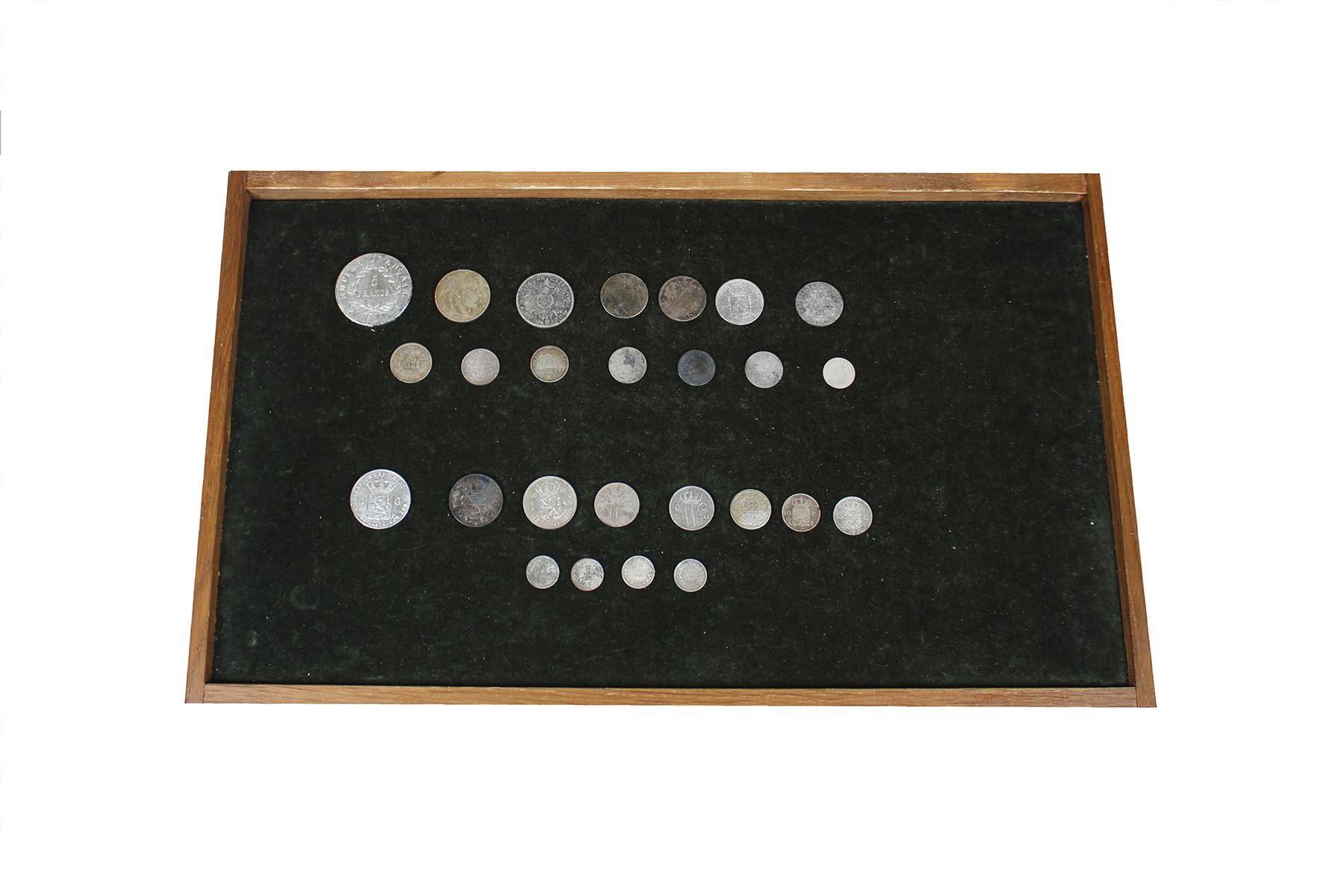 Sigarenblikje zilvergeld Willem I t/m Juliana in niet zo’n beste kwaliteit; ook wat buitenlands zilvergeld in dezelfde kwaliteit. Toch nog bruto 117 gram zilver. ⁂
