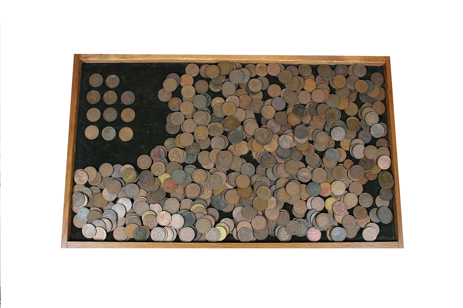 Blikje bronzen centen (1,36 kg.), klein type 1877-1943, w.o. 2 x 1896, 3 x 1897, 3 x 1907, 3 x 1924.