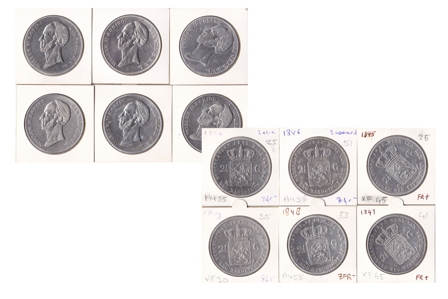 Blikje met 6 rijksdaalders Willem II (1845 t/m 1849). Gemiddeld ruim fraai.