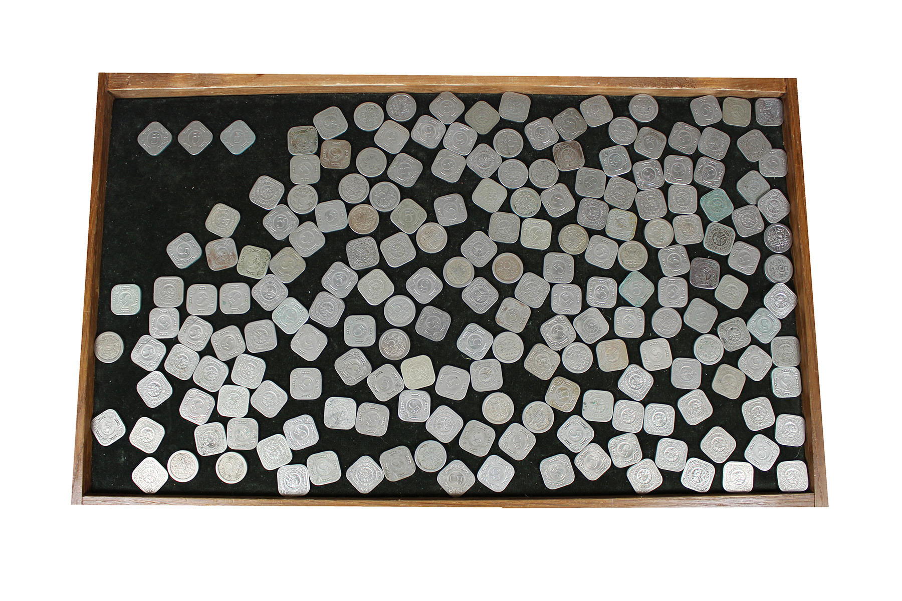 Sigarenblikje (0,86 kg.) ronde en vierkante nikkelen stuivers, w.o. 3 x 1933.