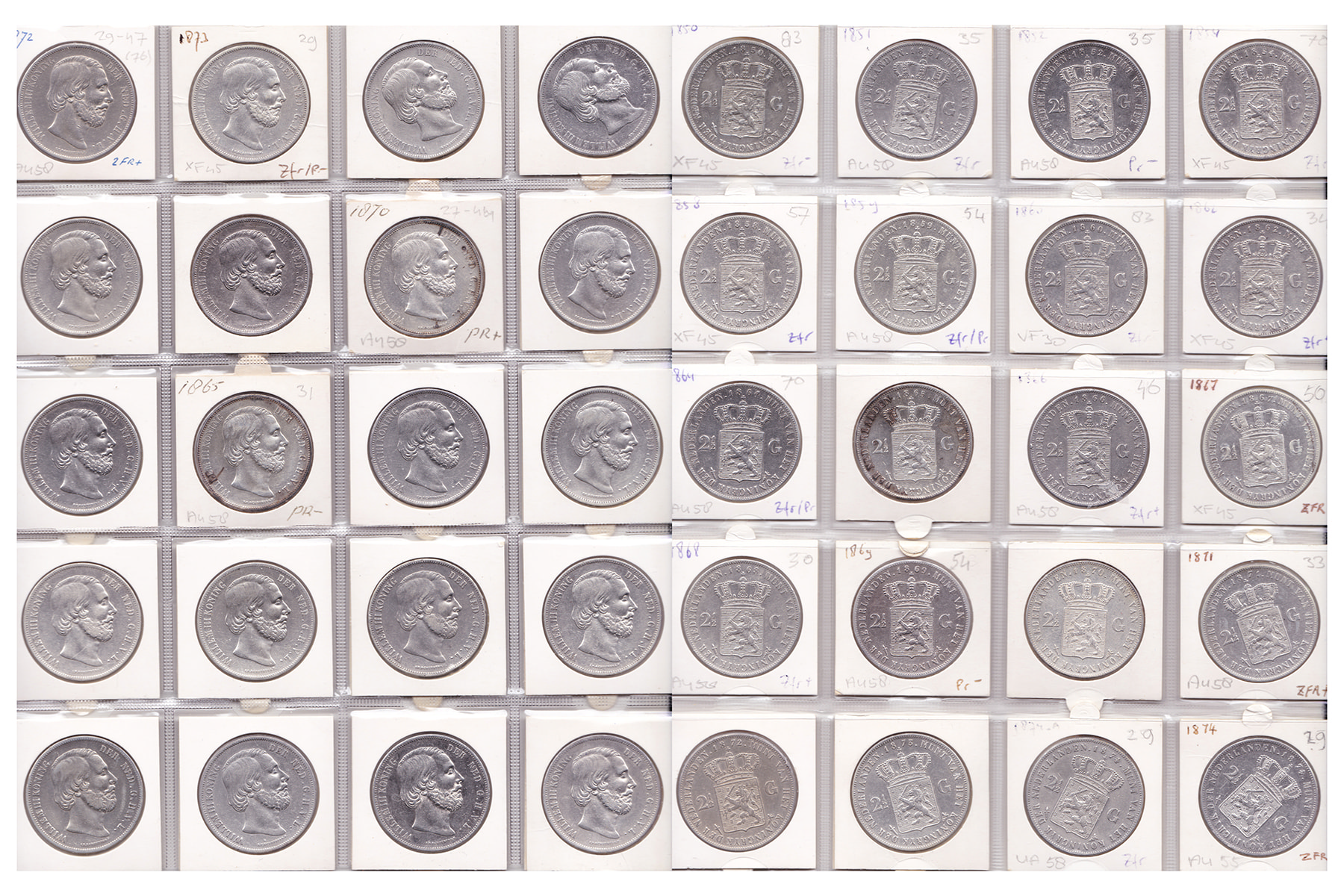 Doosje met 20 rijksdaalders Willem III (1850 t/m 1874). Gemiddeld bijna zeer fraai.