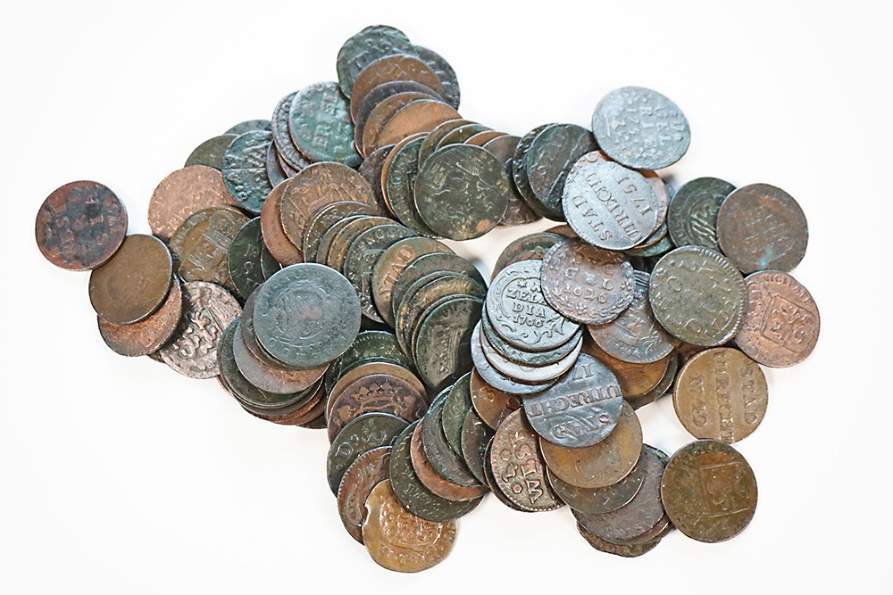 Rond sigarettenblikje met veel duiten. Vnl. Noordelijke Nederlanden ook mindere kwaliteiten (122).