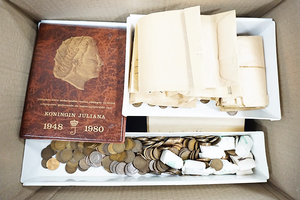 Doos met groot aantal vnl. centen, stuivers van Wilhelmina en Juliana. Los en in albums zeker een paar duizend stuks!!! Veel UNC!!!