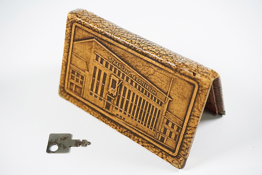 Spaarpot in de vorm van een boek(je) aangeboden door de Spaarbank te Rotterdam. In excellente staat + sleutel(tje). Datering: circa 1957. 96 x 57 mm.