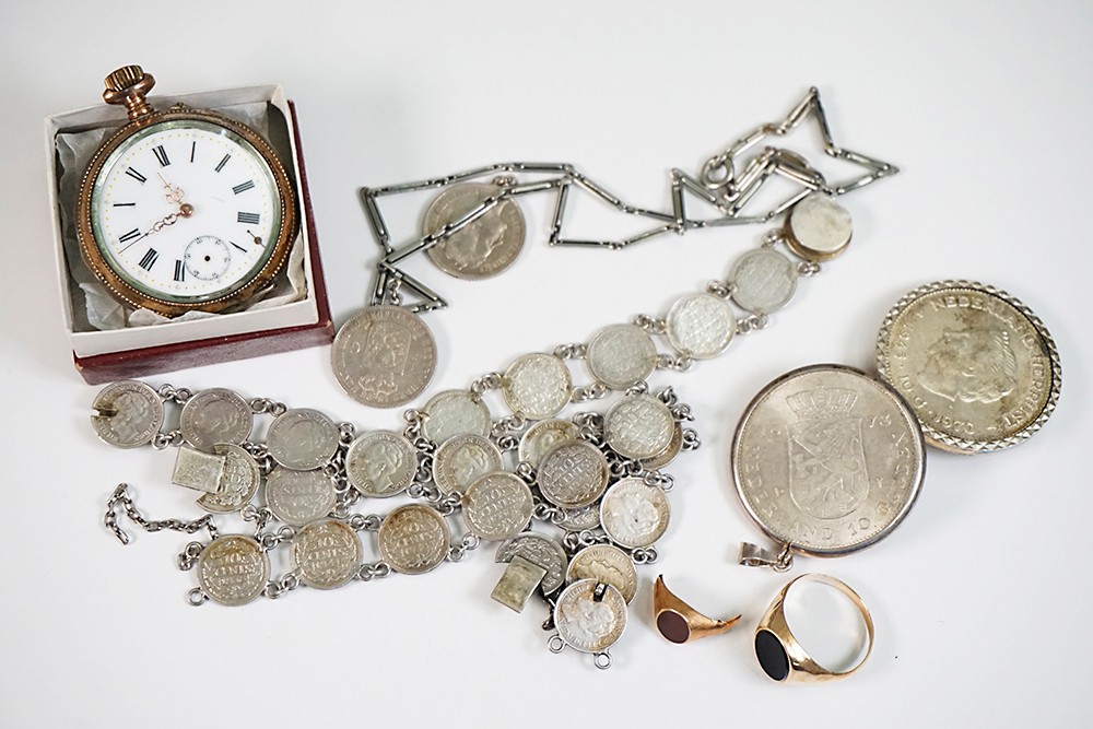 Doosje met diverse sieraden uit munten vervaardigd. Toegevoegd: oud zakhorloge.