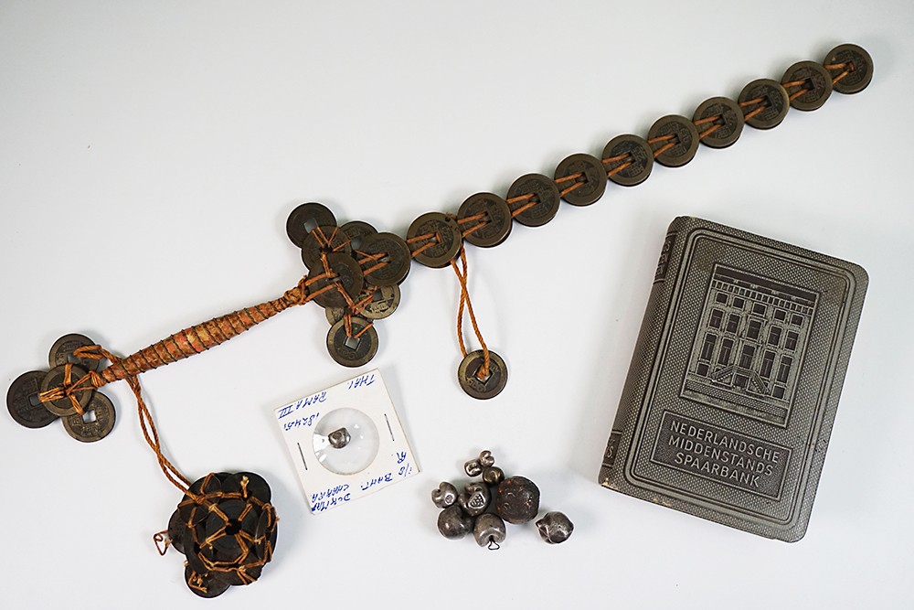 Doos met o.a. “zwaard” van Chinese cashmunten, Siam Bullit Money en NMB spaarpot.