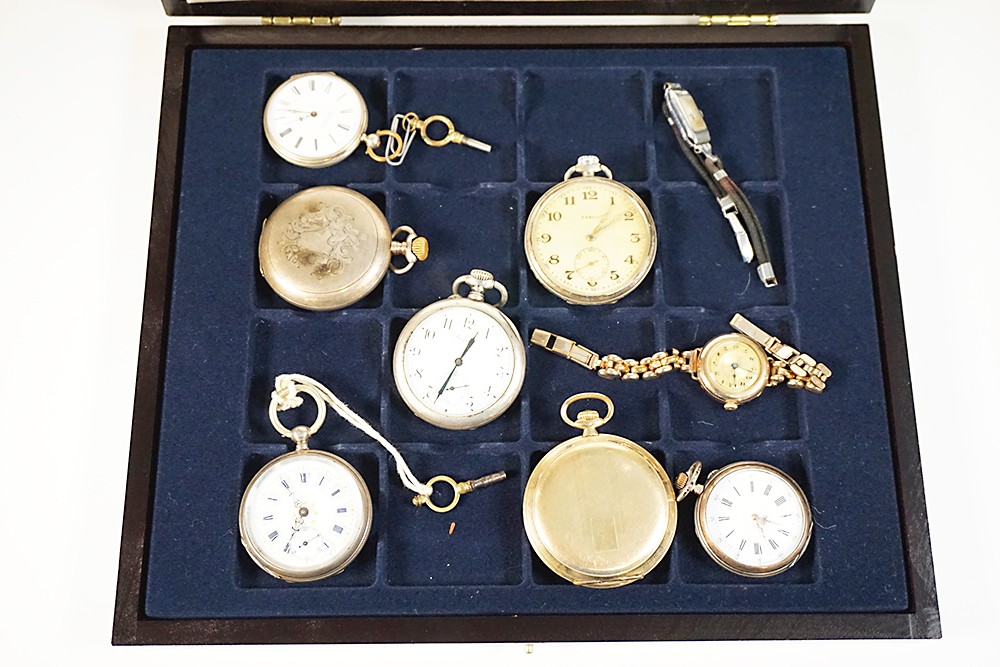 Kistje met 7 zakhorloges. Allen verschillend! Toegevoegd, 2 dameshorloges.