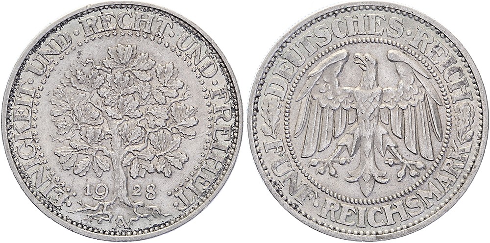 5 Mark 1928A Eichbaum. Jaeger 331; KM 56. Sehr schön.