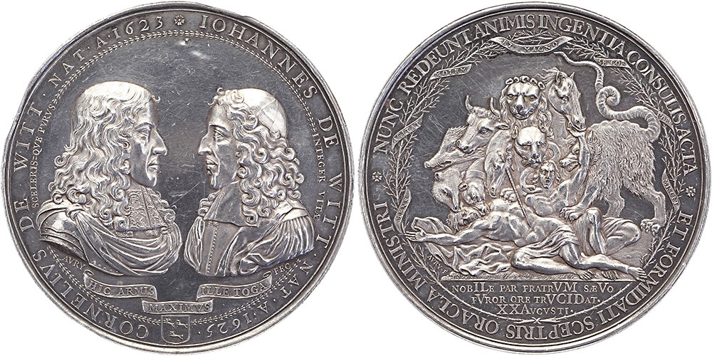 1672 Moord op de gebroeders De Witt. Portretten Johan & Cornelis, elkaar aankijkend. AURY – FEC onder de portretten. / Negenkoppig monster verscheurt de liggende gebroeders. Jaartal in chronogram in afsnede. AR 71,8 [105,82 gram]. Schoongemaakt en twee deukjes rand voorzijde, toch nog prachtig. De keerzijde is aanzienlijk beter. Vgl. vL III-87.1; KPK 1075. Pierre Aury.