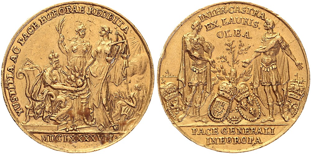 1697 Vrede van Rijswijk. In Romeinse kledij staande Maarschalk Boufflers en Hans Willem Bentinck (Graaf van Portland). Tussen hen bloeiende olijftak. Wapenschilden van Duitsland, Frankrijk, Groot-Brittannië en de Zeven Provinciën. Op- en omschrift: INTER CASTRA EX LAURIS OLEA PACE GENERALI IN EUROPA / Staande Vrede en Gerechtigheid bij zittende Europa. Op- en omschrift: JUSTITIA AC PACE EUROPAE REDDITA MDCLXXXXVIIAU 24 [7,80 gram]. vL IV-208.8; Pax 375. Uitermate zeldzaam. Enige randoneffenheden en wasresten. Zeer fraai / prachtig.
