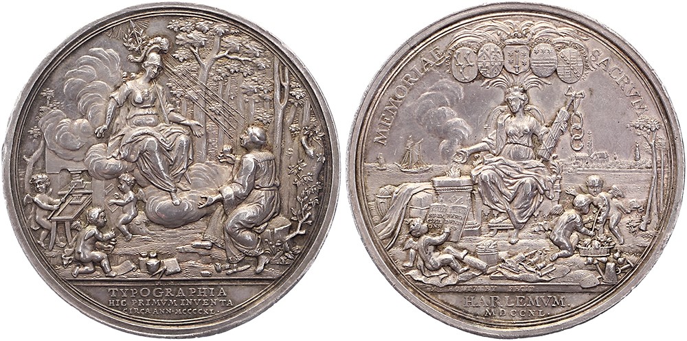 1740 Haarlem, 300 jaar boekdrukkunst. Zittende stadsmaagd. / Knielende Laurens Janszoon Coster ziet op naar Minerva in het Haarlemmerhout.AR 63,5. VvL 145; Jehne 8. M. Holtzhey. Randoneffenheden, vrijwel pracht.