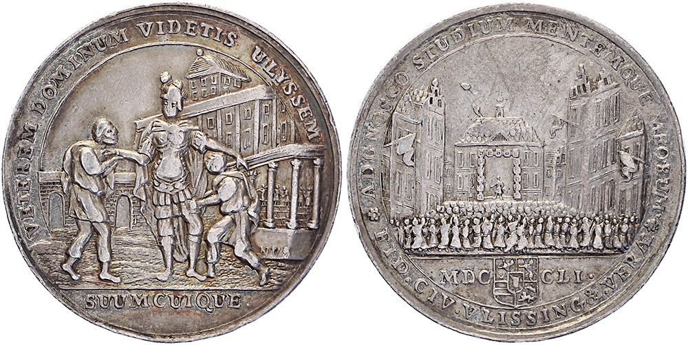 1751 Inhuldiging prins Willem IV als markgraaf van Veere & Vlissingen. Staande prins als Ulysses met Telemachus en Eumenes. / Stadhuis van Veere. VLISSING &. VERÆ in omschrift. AR 32. VvL 298. N. van Swinderen. Zeer fraai.