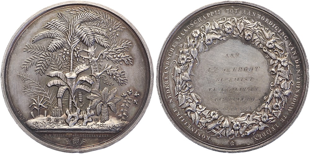 (1849) Bekroningspenning Kon. Ned. Mij. tot aanmoediging van den Tuinbouw te Leijden. Groep bomen: dadelpalm, acacia, cactus, fuchsia enz. / Inscriptieruimte binnen dikke bloemenkrans. Op naam van: A.J. DE GROOT, BLOEMIST, KRALINGEN, ROTTERDAM 1851. AR 48. Dirks 759. Van der Kellen. Deukje in rand. Prachtig.