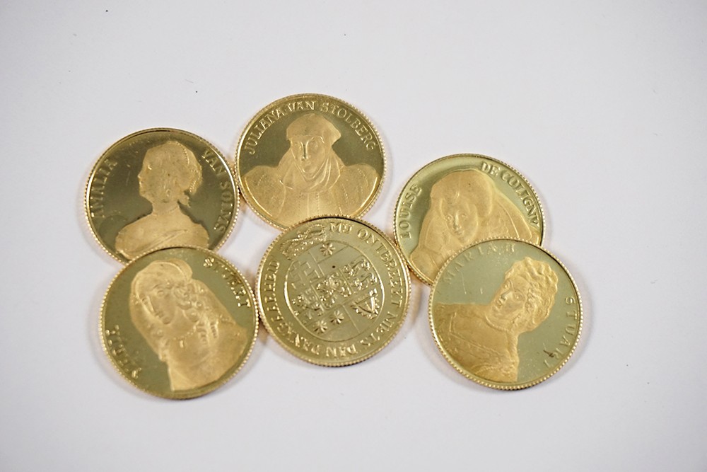 (1965) Prinsessen huis van Oranje. Zes gouden penninkjes geslagen in opdracht van Dobbelman, Nijmegen: Juliana van Stolberg, Louise de Coligny, Amelia van Solms, Maria Stuart, Maria II Stuart, Marie Louise van Hessen-Cassel. AU 20 [3,7 gram, 750/1000]. Prachtig / FDC.