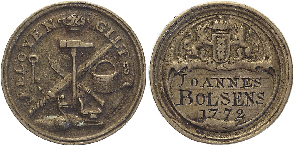 1772 Smeden of Eloyen. Naam onder stadswapen: JOANNES BOLSENS 1772 / Gekroonde hamer, zwaard, mes, sleutel, gieter enz. Messing gegoten 37,5. WK 36.1; Dirks VIII.94. Zeer fraai.