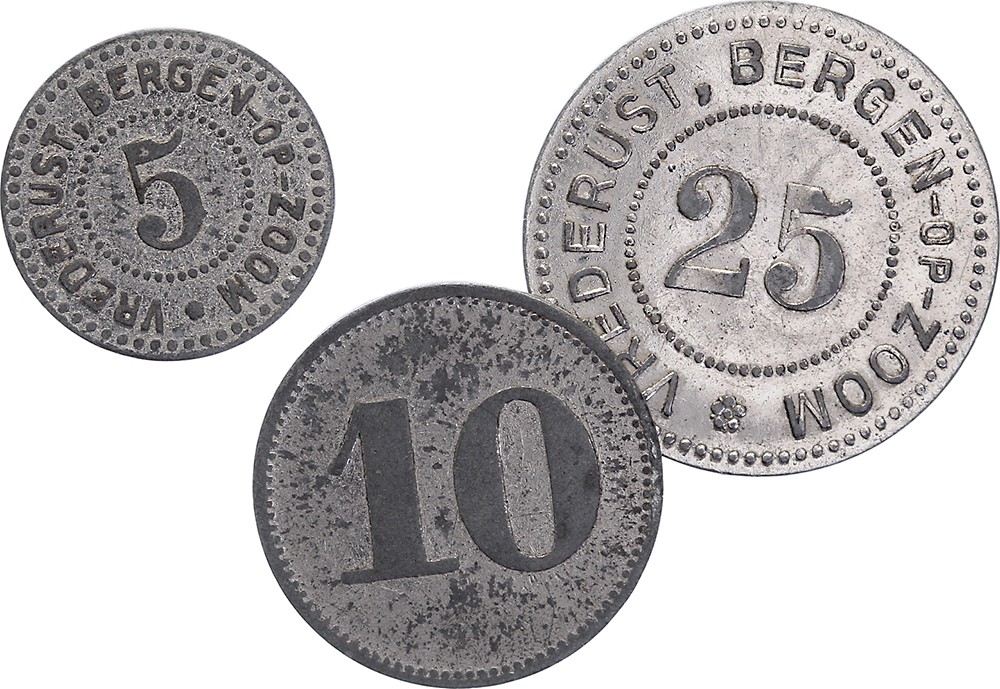 (1924) Psychiatrische inrichting ‘Vrederust’. Betaalpenningen van 5, 10 en 25 (cent). Vernikkeld zink 17,7, 21,8 en 25.3 mm. Kooij IT 018.1 t/m 3. Zeer fraai.
