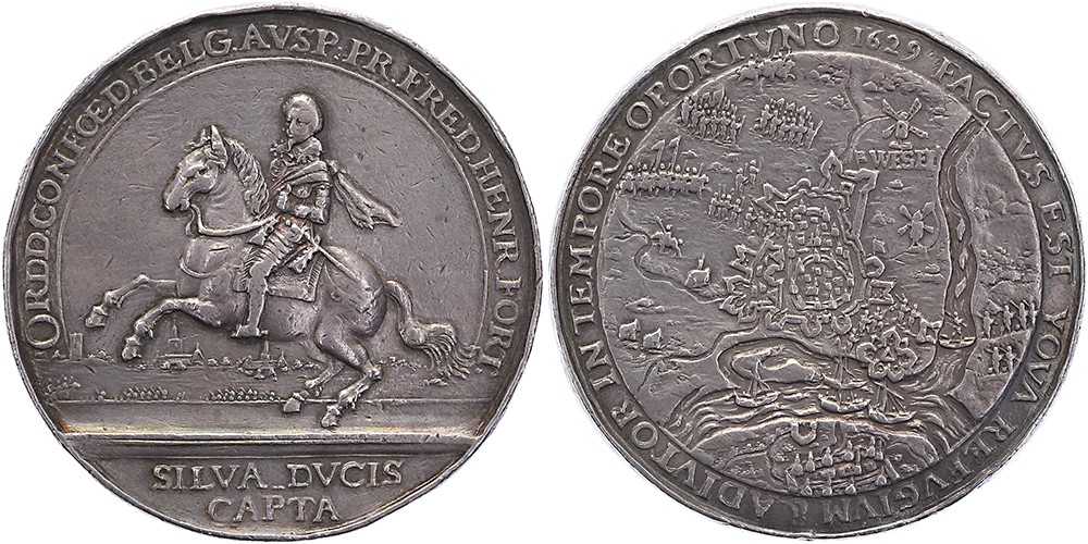 1629 Beleg en inname door Frederik Hendrik. Frederik Hendrik te paard naar links, met op de achtergrond ’s-Hertogenbosch. / Bovenaanzicht van Wesel met rivieren. AR 58. vL II-180/178; JMP 1953.11. W. Versteegh. Zeer fraai.