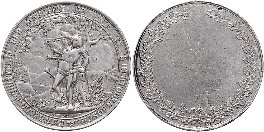 1845 Als voren. Variant. Keerzijde: paar samengevlochten lauwertakken zonder tekst. Afgietsel in tin zo mogelijk een ontwerp. Zeer fraai.